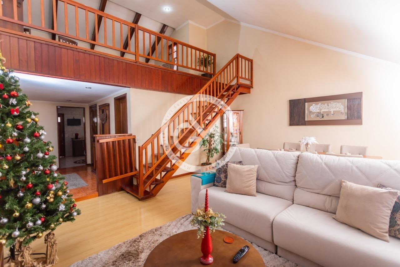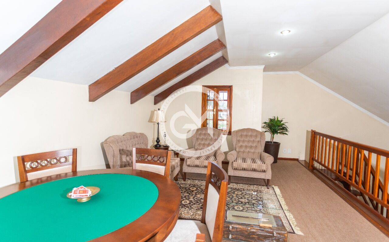 Possui ampla sala de estar com mezanino para sala de lazer, com pátio, cozinha americana, lareira, área de churrasqueira e forno a lenha.